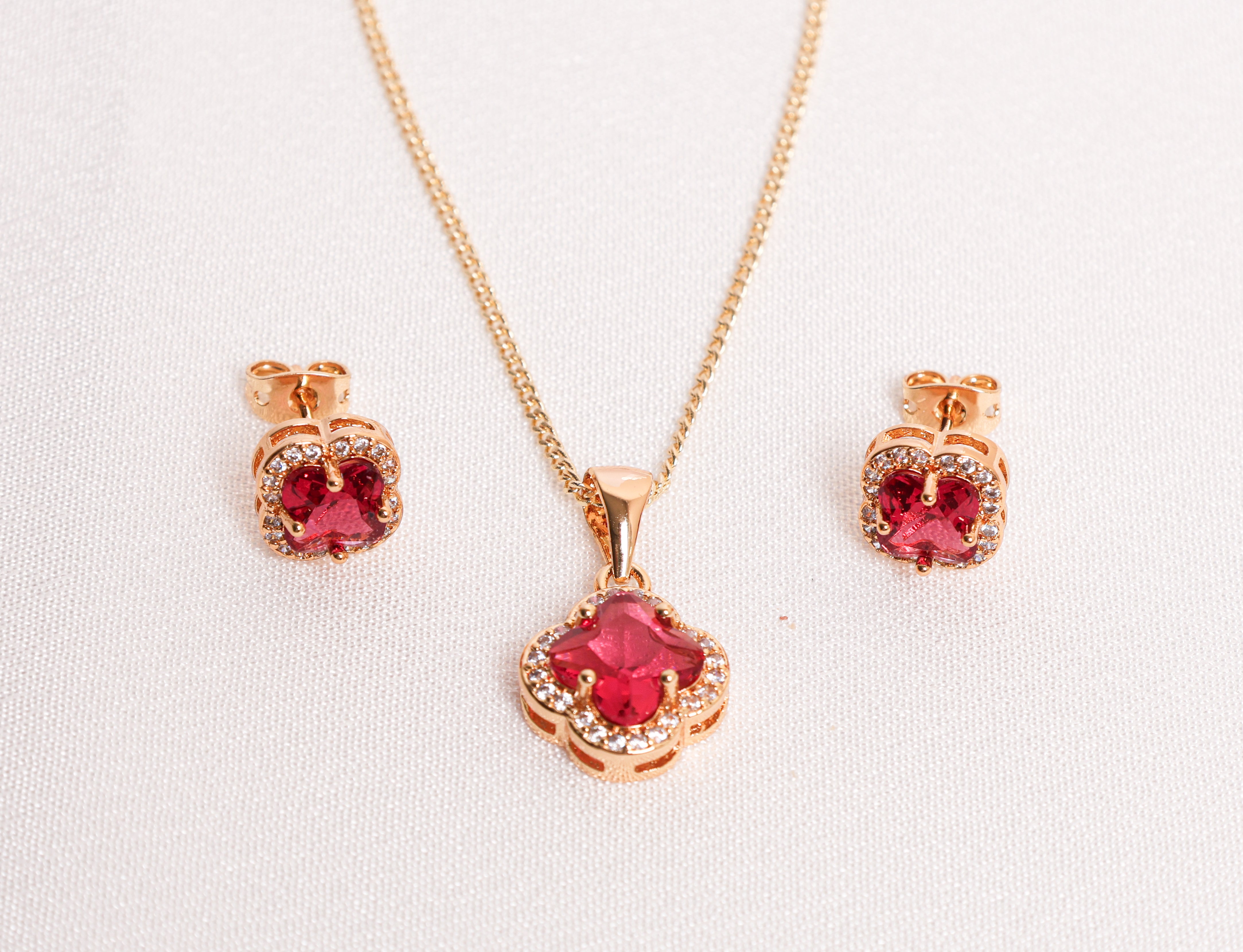 Red clover jewelry set trimmed with gold and embedded with sparkling stones. Refined and bold. Read more