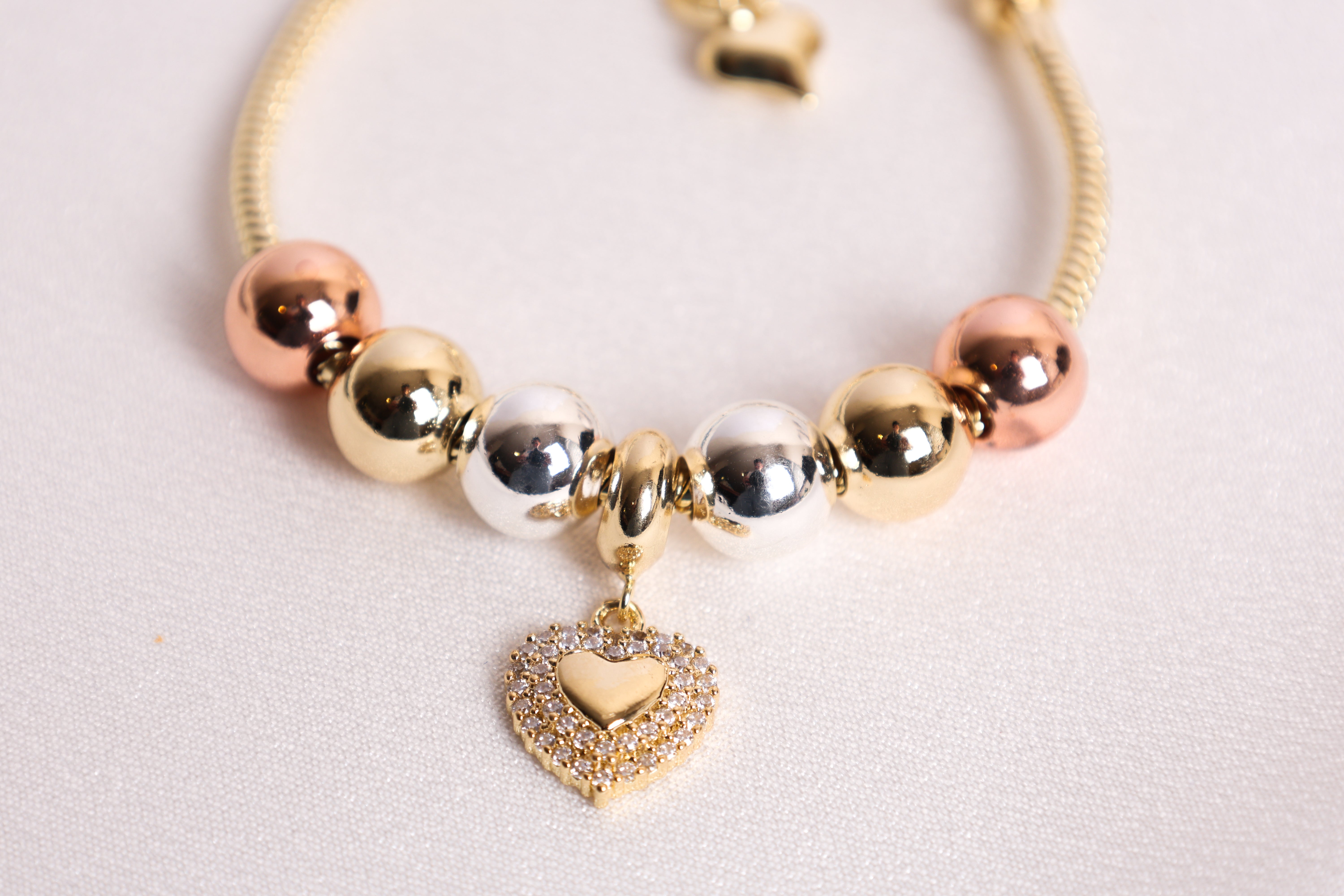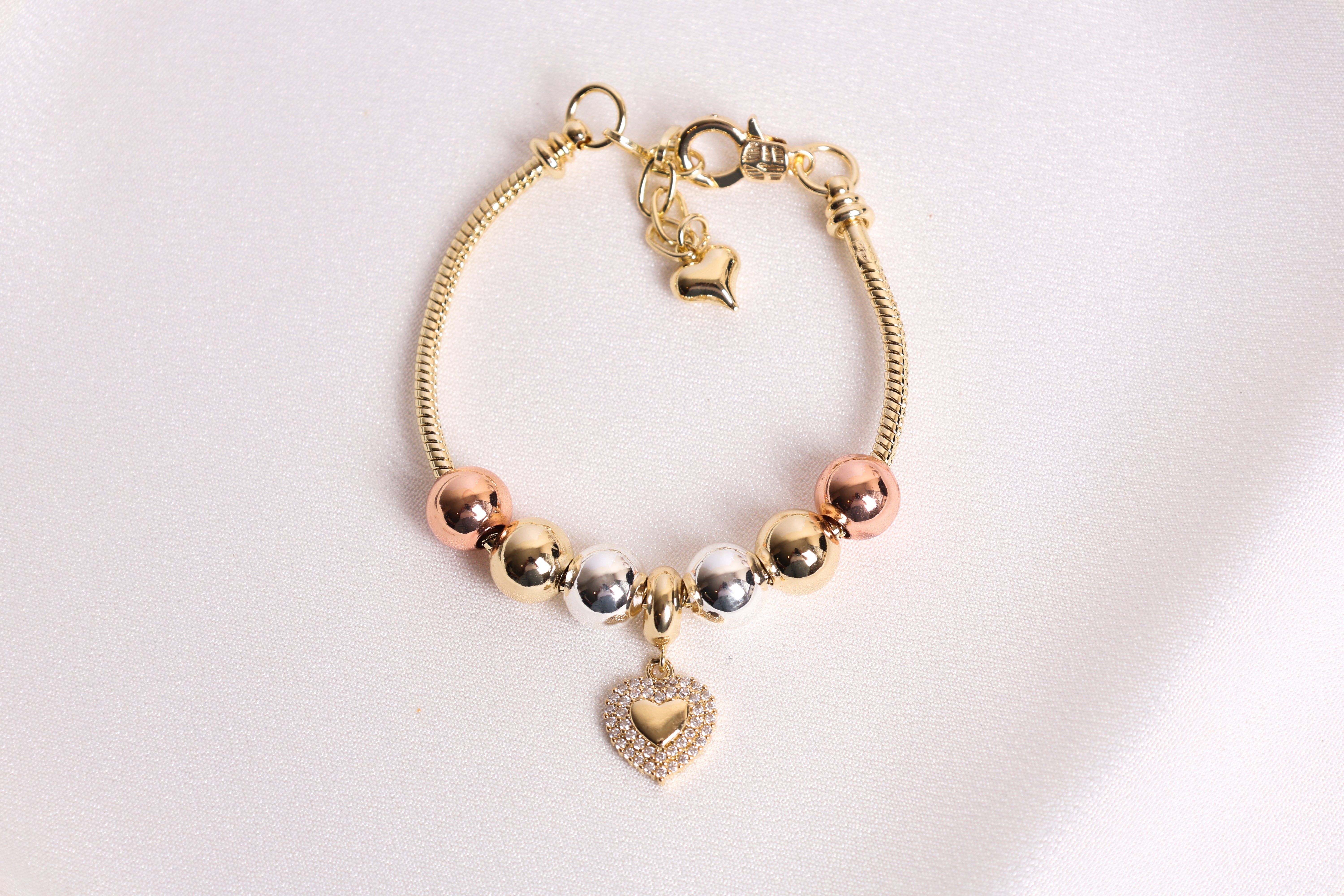 Three-Tone Beaded Bracelet with Sparkling Heart Charm